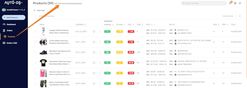 If you have any untracked products, sync them to AutoDS through the Products tab on the left menu. On the top, the number of your untracked listings will appear, if you have any. Click on it to configure and start their import process.